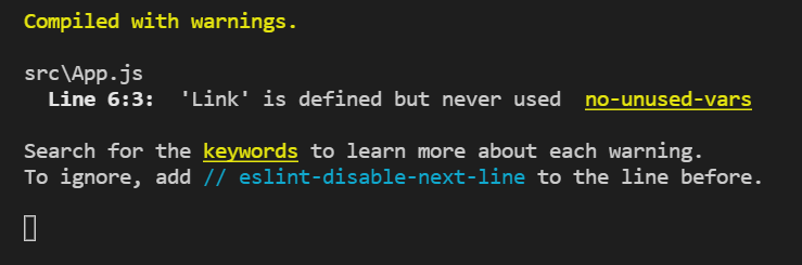 Warning 이유는 react-router-dom에서 Link를 import 했으나, html 코드를 지워 Link to 기능을 사용하고 있지 않기 때문이다. 크게 상관 없을듯하다.