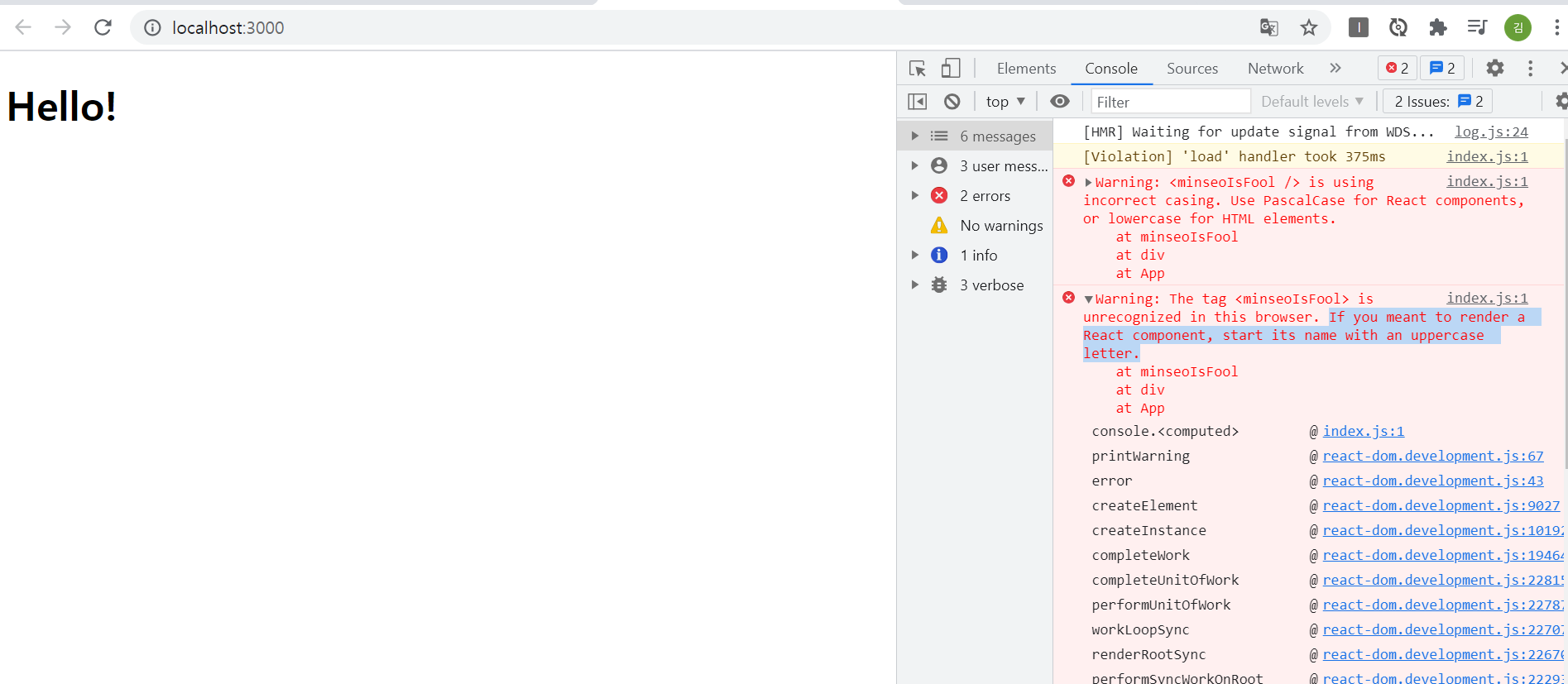 // minseoIsFool 컴포넌트명이 소문자로 이루어짐.