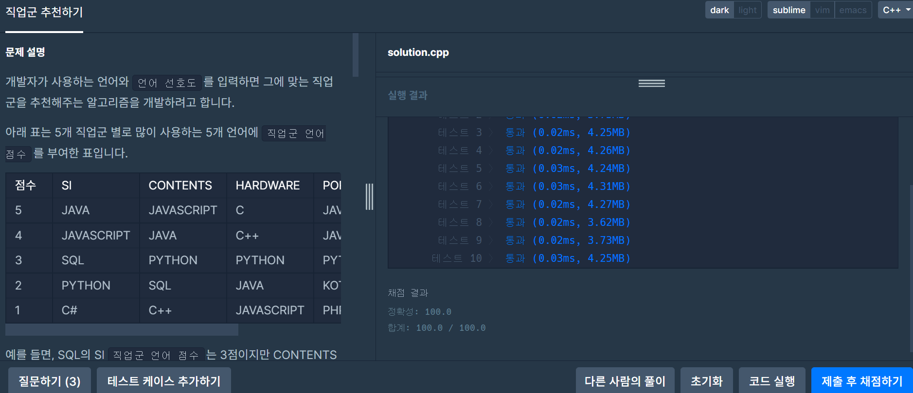 table이나 languages 벡터의 길이가 최대 10이므로 시간복잡도를 걱정할 필요가 전혀 없는 문제이나,