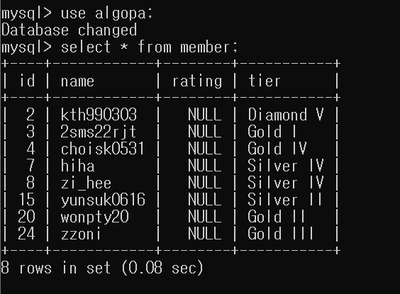 현재 DB에는 8개의 데이터들이 들어 있다.