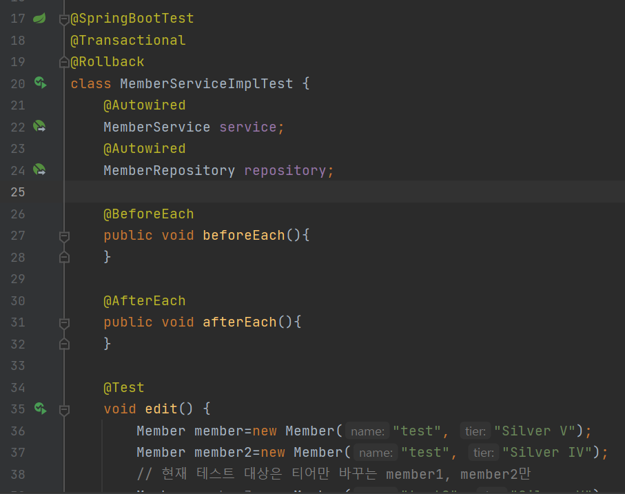 @BeforeEach, @AfterEach에 별다른 코드 없이 @Rollback 기능만 붙여주었다.