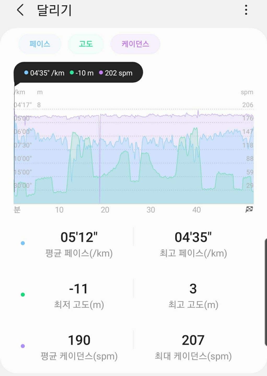 빠르게 달리려고 한 건 아닌데, 생각보다 빠른 페이스가 나왔다. 5'12'' 페이스이며, 운동을 마칠 때 크게 힘들지도 않아 심박수도 190보다 아래이지 않았을까 예상한다.