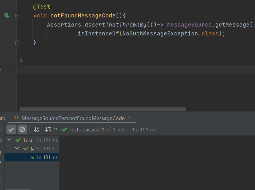 위 코드에선, no_code라는 메시지가 저장돼있지 않아 람다식에서 NoSuchMessageException 에러를 throw해주었으며, 따라서 isInstanceOf에서 예상한 에러 종류와 일치하므로 Test가 Pass한다.