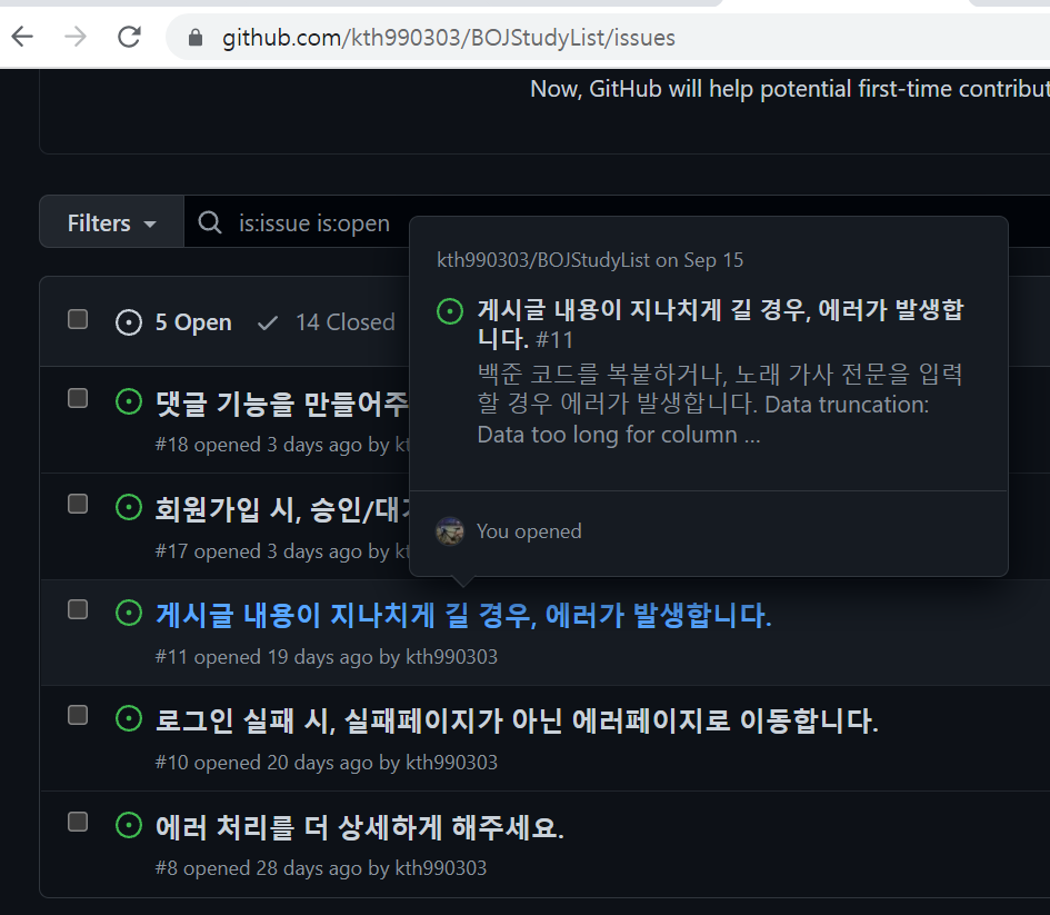 참고로 이거 개인프로젝트인데도, 내가 issue로 문제 제기하고, 내가 에러처리하고 내가 close issues를 하다보니, 이중인격이 되는 것 같다.
