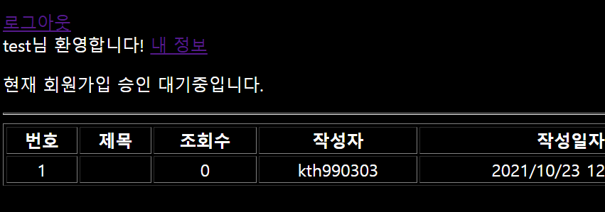 또한, 관리자 계정으로 로그인하니까, 승인대기회원이 1명 대기중임을 확인할 수 있으며, 이는 USER, GUEST 계정으로 로그인할 땐 보이지 않는다.