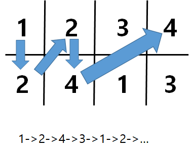 처음 섞을 때는 2, 4, 1, 3이 되고,
