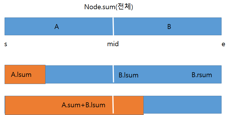- 위 두 개는 모두 s 또는 e에 딱 붙어있는 경우이므로 A.rightSum + B.leftSum의 경우도 구해준다.