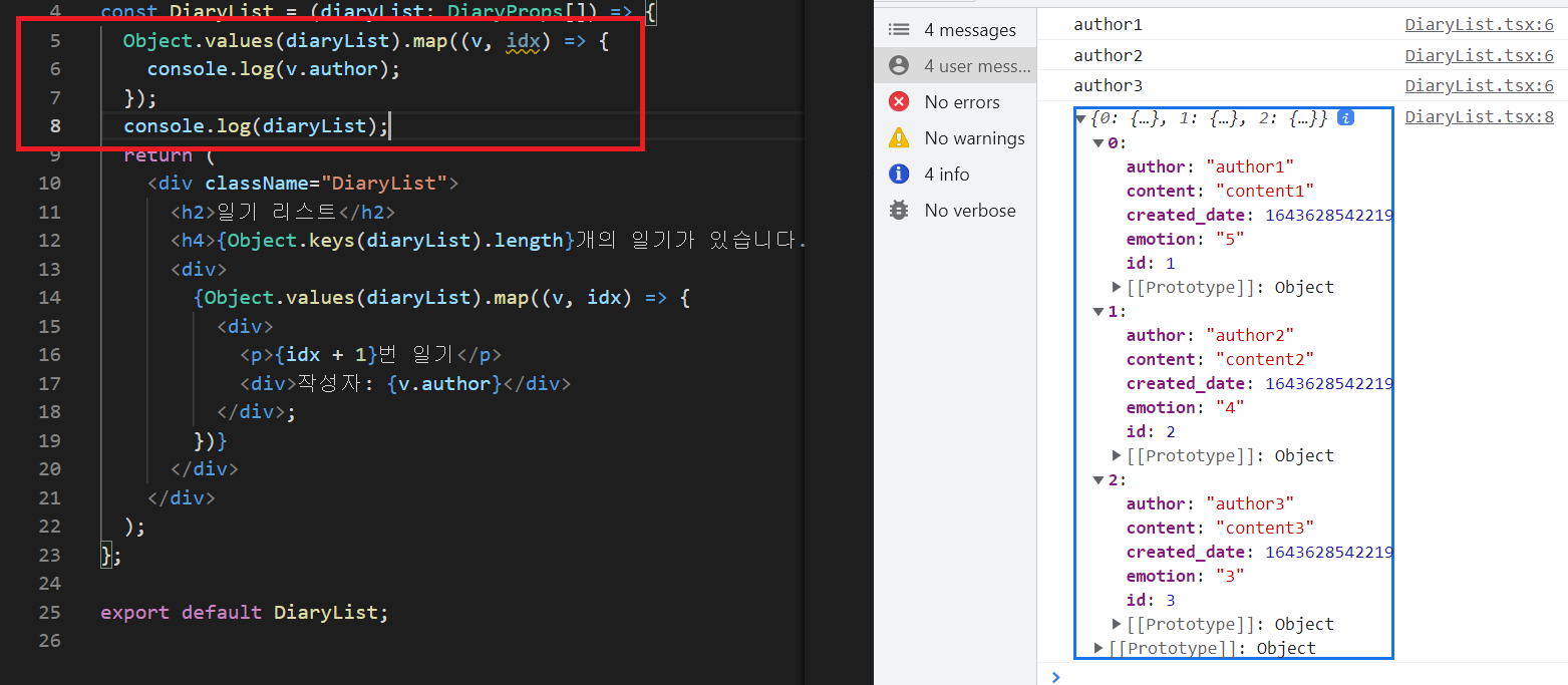 코드에서 5~7번째 라인에서 map으로 diaryList를 순회하여 일기장 작성자 author를 출력하도록 하였고,