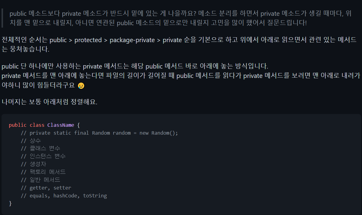 public 메소드로부터 분리된 private 메소드(즉, 연관있는 메소드)는 그 메소드 바로 밑에 놓는 것을 추천해주셨다.