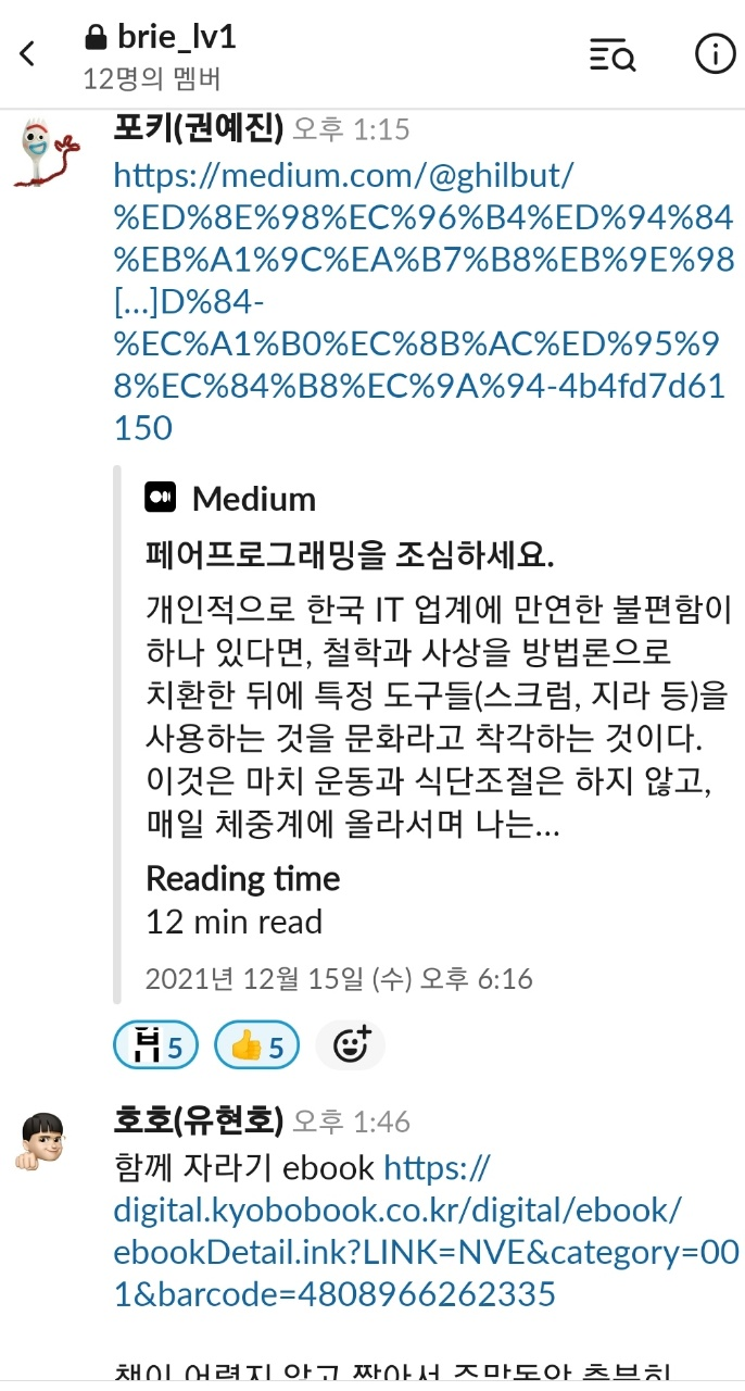페어 프로그래밍에 대한 얘기를 나누면서 참고하면 좋은 책과 사이트들을 공유해주는 크루들의 모습이다.