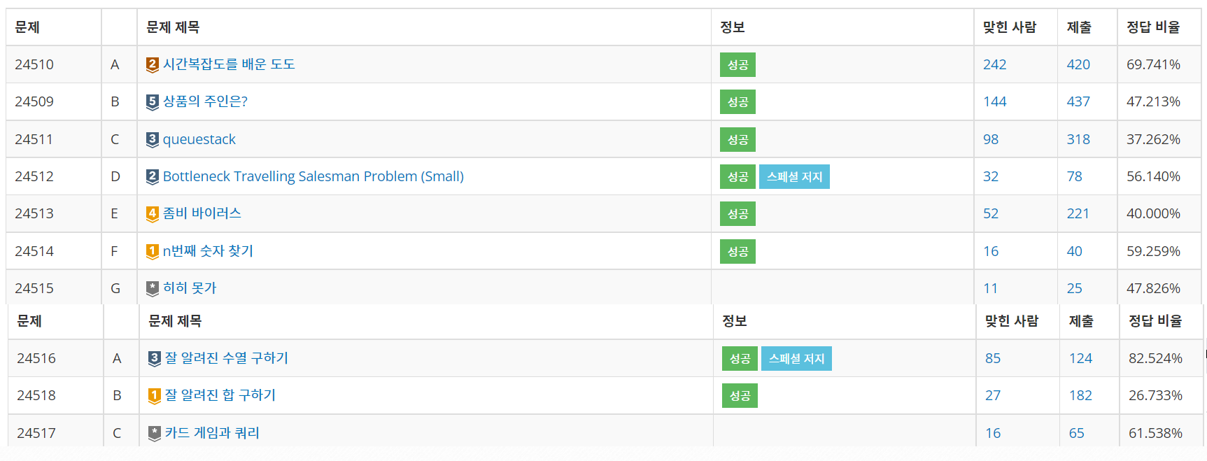 그 외에 https://www.acmicpc.net/problem/24519 (K번) 이 문제도 꽤 많이 풀렸던데, N 범위를 보고 TSP를 이용하겠다는 감은 왔으나, 뭔가 잘 풀리지 않아 다른 문제에 시간을 투자했다.