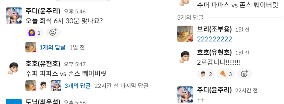 실제 슬랙 4기-잡담방에 투표를 올려서 헤어져라 VS 헤어지지 마라 로 올렸고,