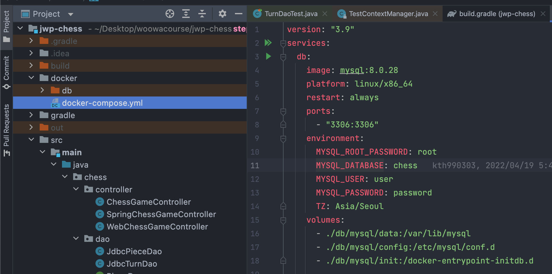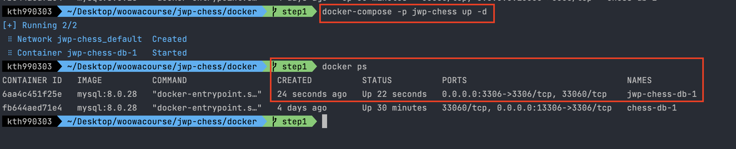 나는 chess 웹 미션을 진행중이었기 때문에 MYSQL_DATABASE 이름은 chess로 설정해주었다.