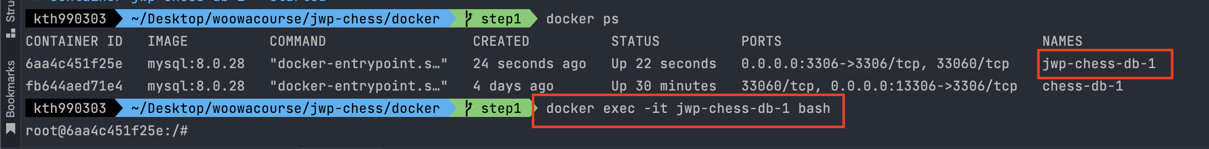 주의할 점은, docker ps 명령어로 확인된 빨간 박스 안의 NAMES의 이름을 bash해주어야 한다는 점이다!