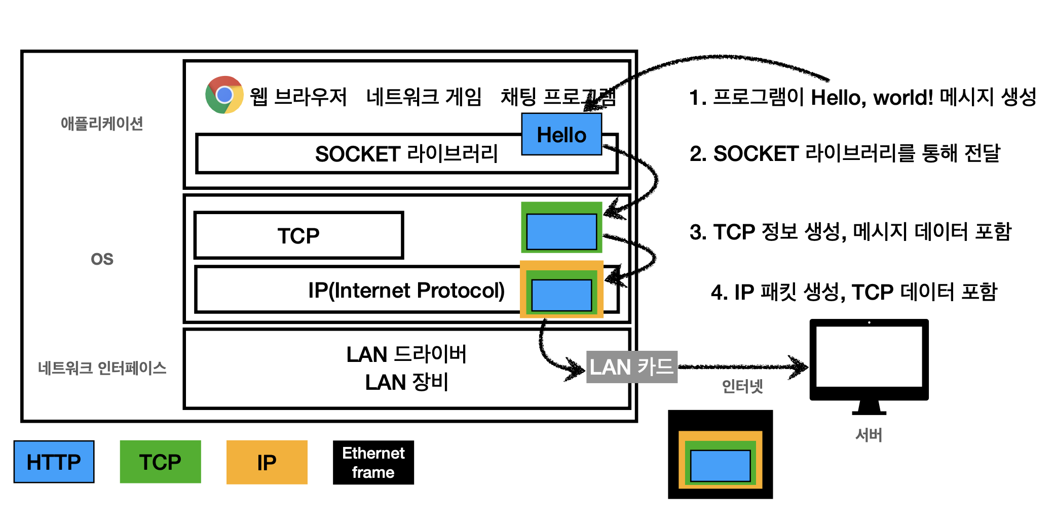 Hello, world!를 전송하기 위해선 전송 데이터 뿐만 아니라 출발지 IP, 도착지 IP, 기타 내용들도 함께 패킷에 담겨있어야 요청/응답이 가능하다. 그래야 요청 주체, 응답 주체를 확인할 수 있기 때문이다.