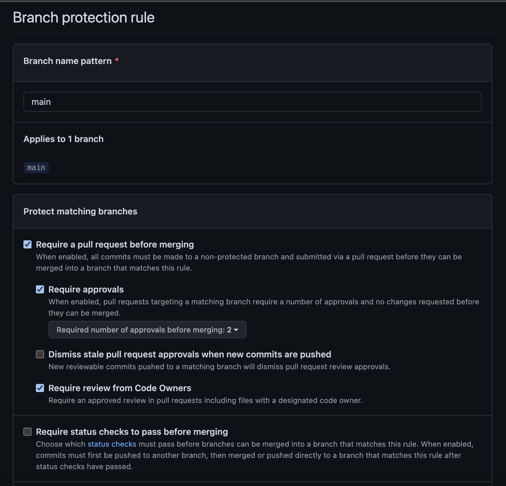 이제 merging 조건을 설정해두기 위해 Require a pull request before merging을 체크표시 하면 위와 같이 체크항목들이 추가로 생길 것이다. Require approvals로 최소 코드리뷰어의 approve가 몇 개 이상 있어야 머지 가능할지 선택할 수 있다. Require review from Code Owners로 레포지토리 주인의 코드리뷰를 필수로 필요로 하게 설정할 수 있다.
