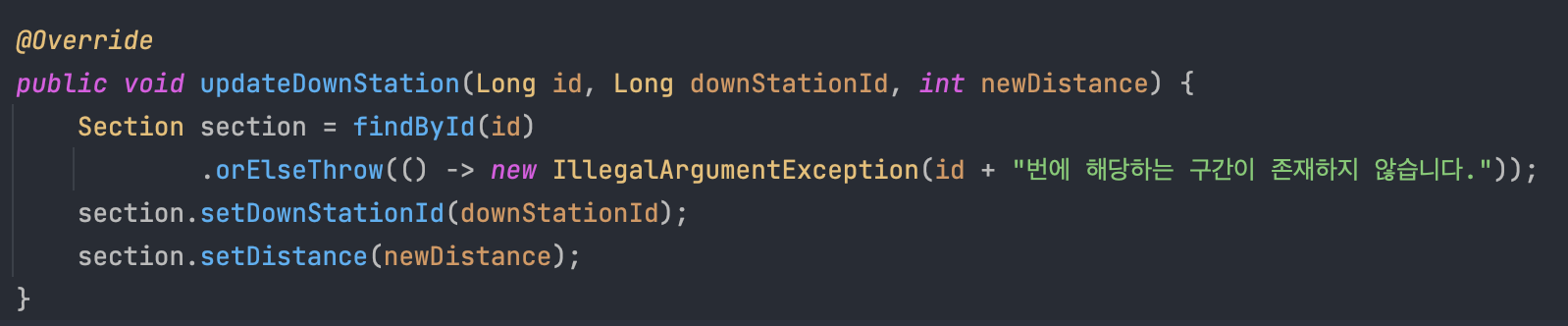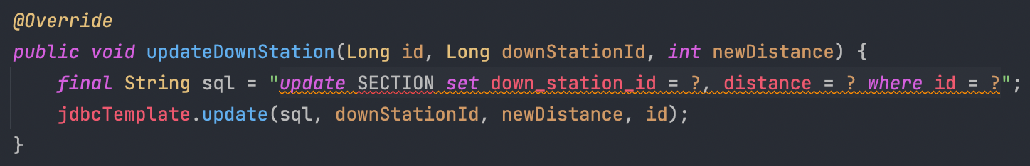 스프링 Jdbc를 사용하지 못하고 List<Station>을 상태로 가지므로 stream으로 findById를 진행해준 후, update는 도메인에서 setter method (!!!)를 이용해서 하고 있다. 특정 도메인을 update하는 과정은 sql 쿼리문을 이용한다면 where절로 바로 진행할 수 있지만, 1단계 dao 코드로는 stream으로 해당 도메인을 찾아서 직접 update를 해줘야 했다.