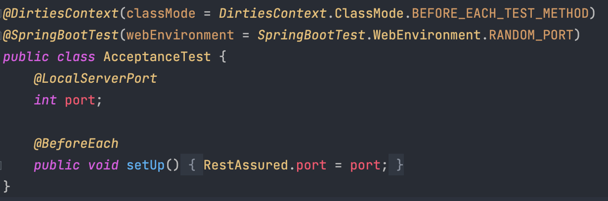 바로 테스트 격리를 위해 각 테스트 케이스마다 컨텍스트를 재생성해주는 어노테이션이다. 테스트들은 순서에 상관없이 독립적으로 수행돼야 한다. 따라서 테스트 격리가 이루어져야 한다. 그 이유로, 각 테스트마다 같은 자원 (ex. database)를 공유하기 때문에 테스트 격리가 제대로 되지 않는다면 독립적으로 수행될 수 없기 때문이다. 따라서 매 테스트마다 기존 애플리케이션 컨텍스트를 폐기하고 새로운 컨텍스트를 재생성해주도록 @DirtiesContext를 붙여주어야 한다.