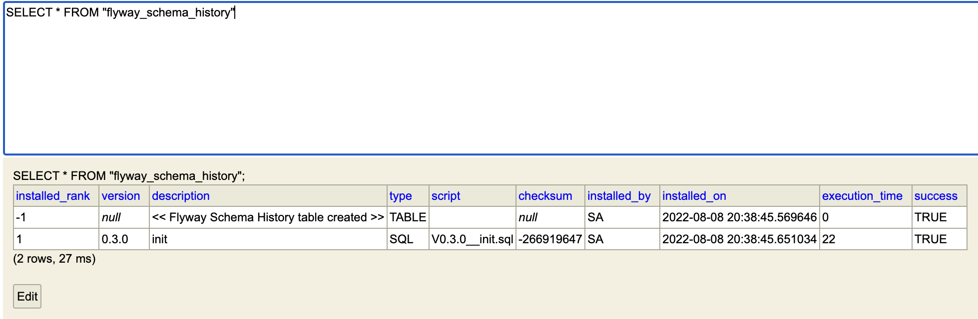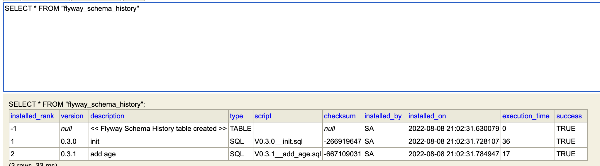 위와 같이 flyway_schema_history가 생성됐고, 작성한 스크립트들이 모두 나오면 성공이다.