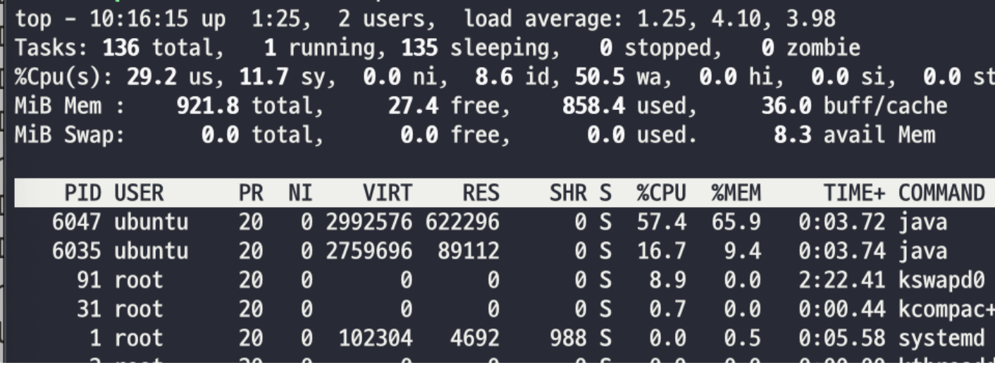 실제로 소나큐브의 일라스틱서치는 1기가가 훨씬 넘는 램 용량을 차지하고, 위 스샷은 다운되기 직전에 찍은 것이다.