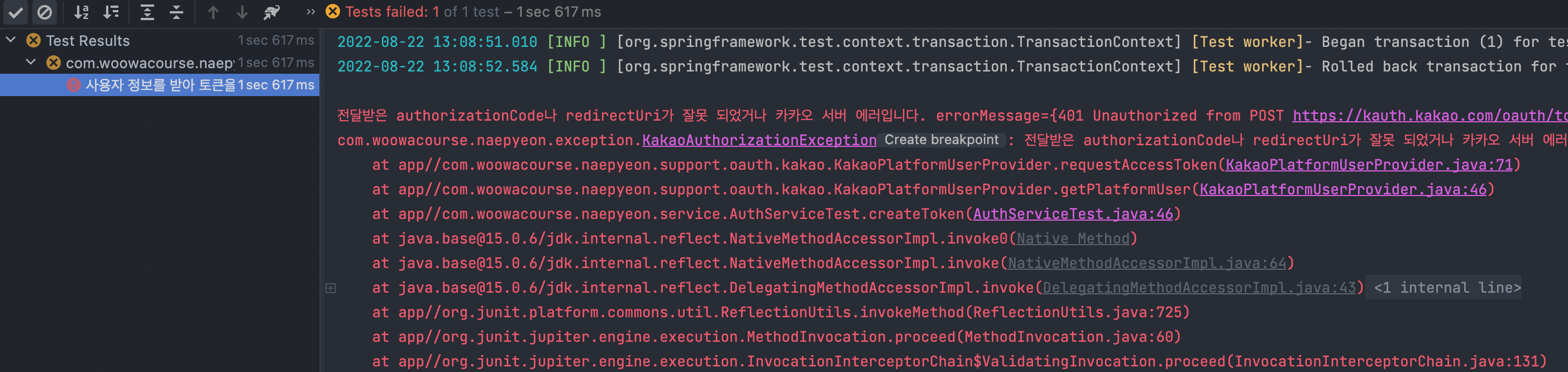 이처럼 @SpyBean은 실제 객체의 메서드를 사용하기 때문에 아래와 같이 @SpyBean으로 kakaoPlatformUserProvider를 등록해주고, 해당 객체의 getPlatformUser(anyString(), anyString())를 호출하여 작성하면 테스트가 실패한다.