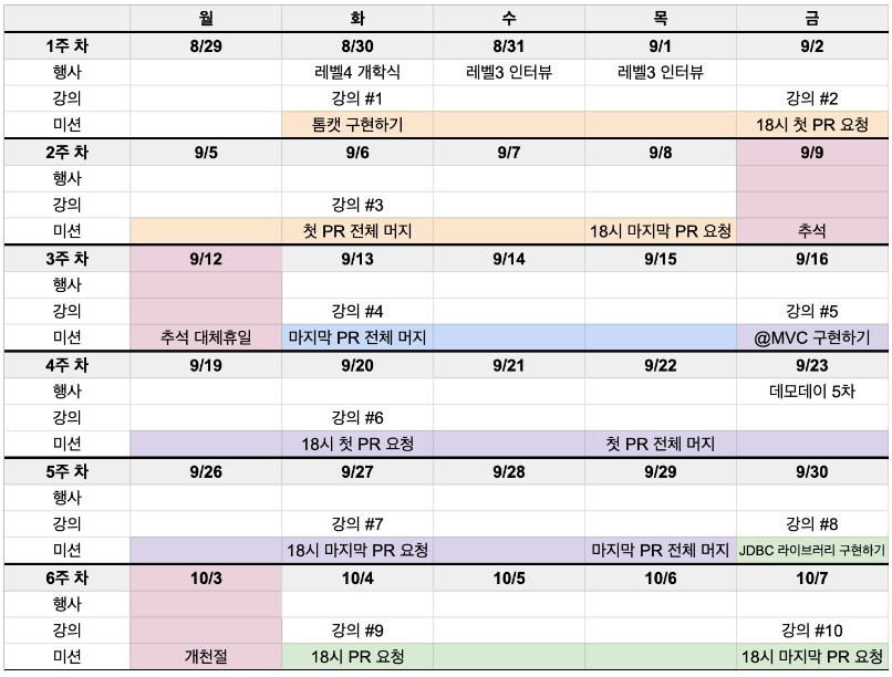 레벨4에 들어서면서 그동안 우리가 흔히 사용했던 스프링에 대해 좀 더 딥하게 알아보고 구현해보는 시간을 가지게 됐다. 아래는 우테코 레벨4 일정이다.