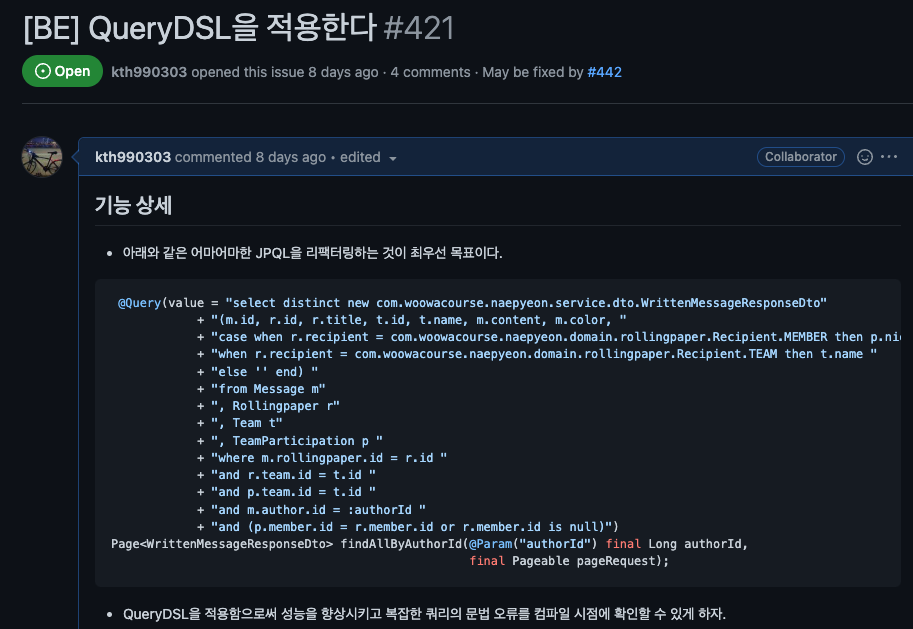 기능 상세 아래와 같은 어마어마한 JPQL을 리팩터링하는 것이 최우선 목표이다. @Query(value = "select distinct new com.woowacourse.naepyeon.service.dto.WrittenMessageResponseDto" + "(m.id, r.id, r.title, t.id, t.name...