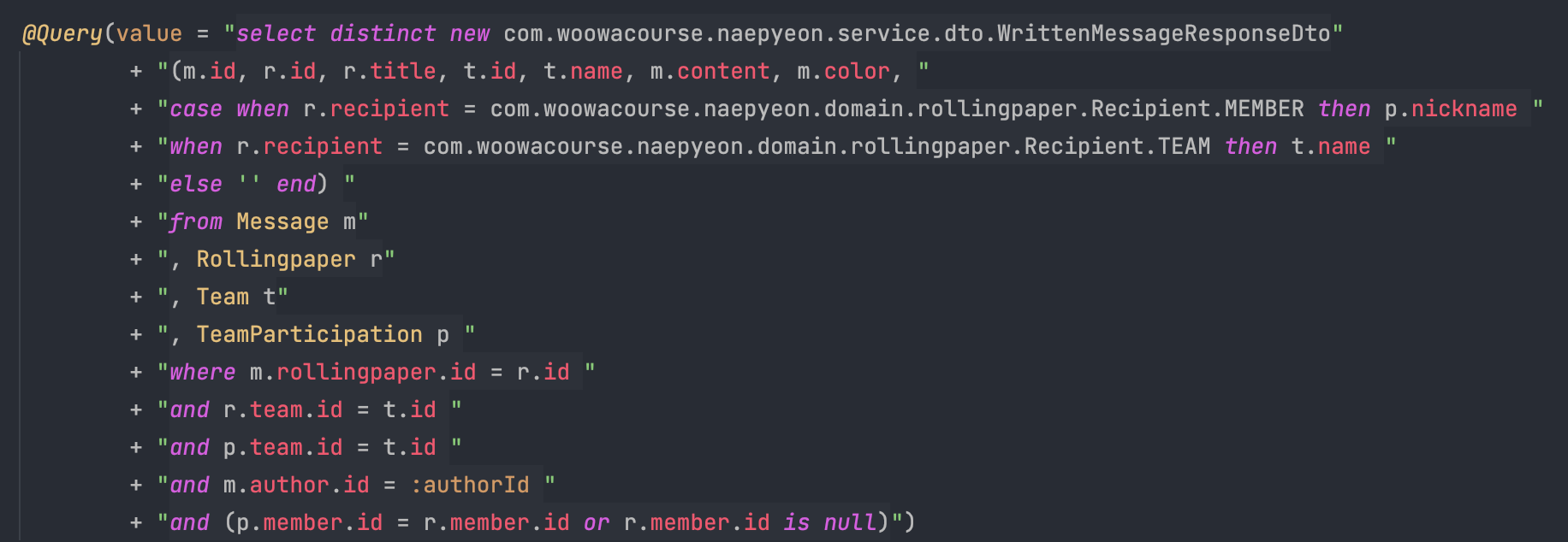 메시지 수신인의 해당 팀 nickname을 얻기 위해 TeamParticipation을 세타조인하는 것이기 때문에 TeamParticipation과 Team끼리 양방향 연관관계를 맺을까도 고민했고, 그 외 여러 방법을 고민해보았다.