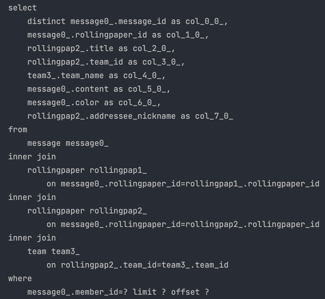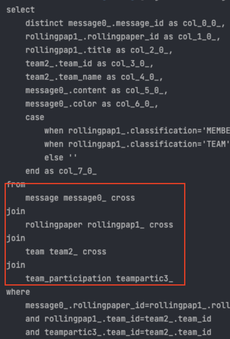 TeamParticipation은 rollingpaper, message, team에서 따로 가져올 방법이 없기 때문에 현재 구조에서는 theta join을 이용하는 수밖에 없었다. 따라서 실제 SQL문으로는 cross join이 나가게 되고, 이는 치명적인 성능 저하를 일으킨다.