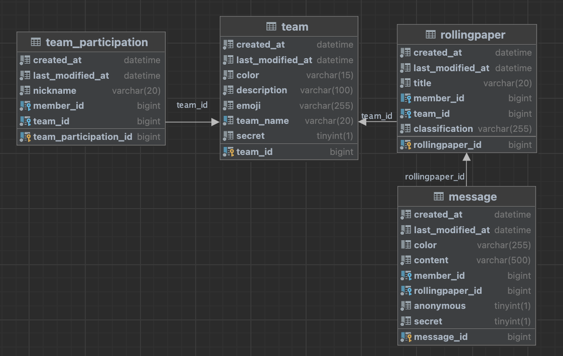 그 중 한가지 방법이 바로 rollingpaper에 TeamParticipation에 존재하는 nickname을 컬럼으로 가지기이다.