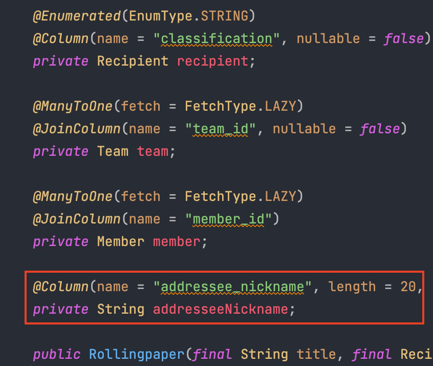 Rollingpaper에 수신인의 닉네임 정보를 컬럼으로 가지도록 추가해주었다.