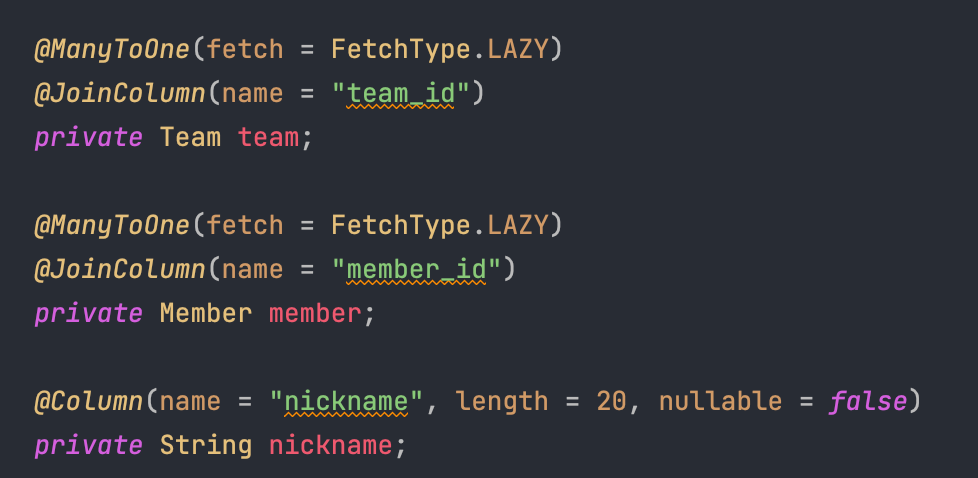회원(Member)과 모임(Team)의 중간테이블인 TeamParticipation에서는 회원이 해당 모임에서 사용할 닉네임을 컬럼으로 가진다.