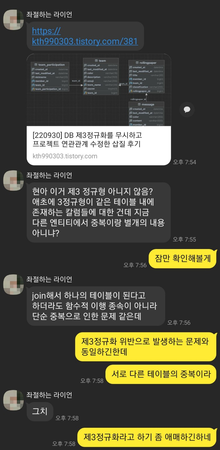 DB 제3정규화 위반 시 발생할 수 있는 문제점들을 감수하고 동일 컬럼인 nickname을 TeamParticipation에도 넣고 Rollingpaper에도 넣어두었다.