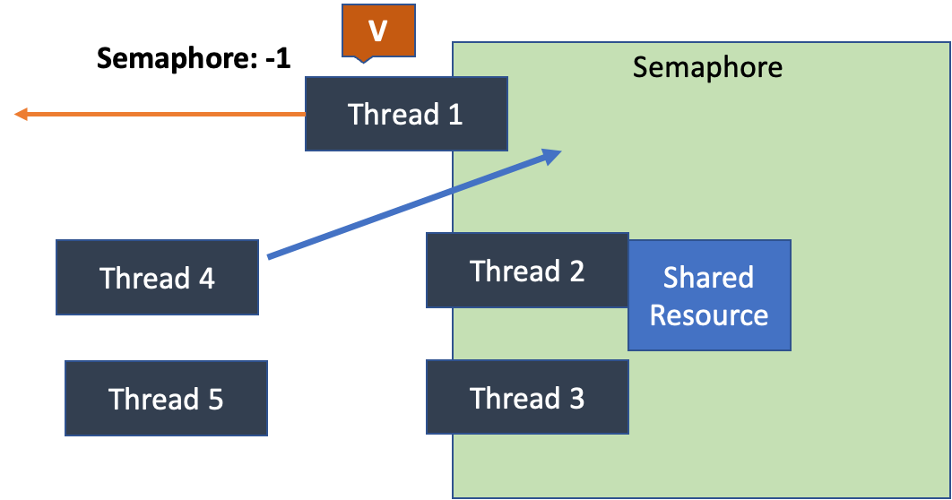 스레드 1이 공유 자원을 사용하지 않는 상태가 될 때 V 함수를 실행한다. V 함수가 실행되면 세마포어 숫자를 1 증가시킨다.
