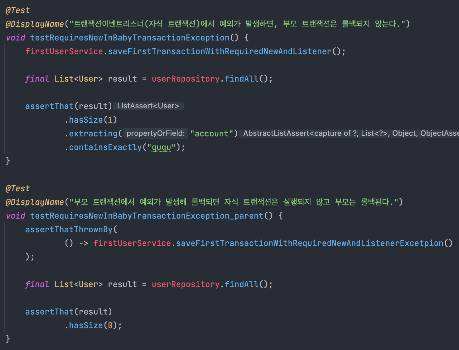 위와 같이 자식을 REQUIRES_NEW, @TransactionalEventListener로 등록해주면 아래 학습테스트가 통과한다.