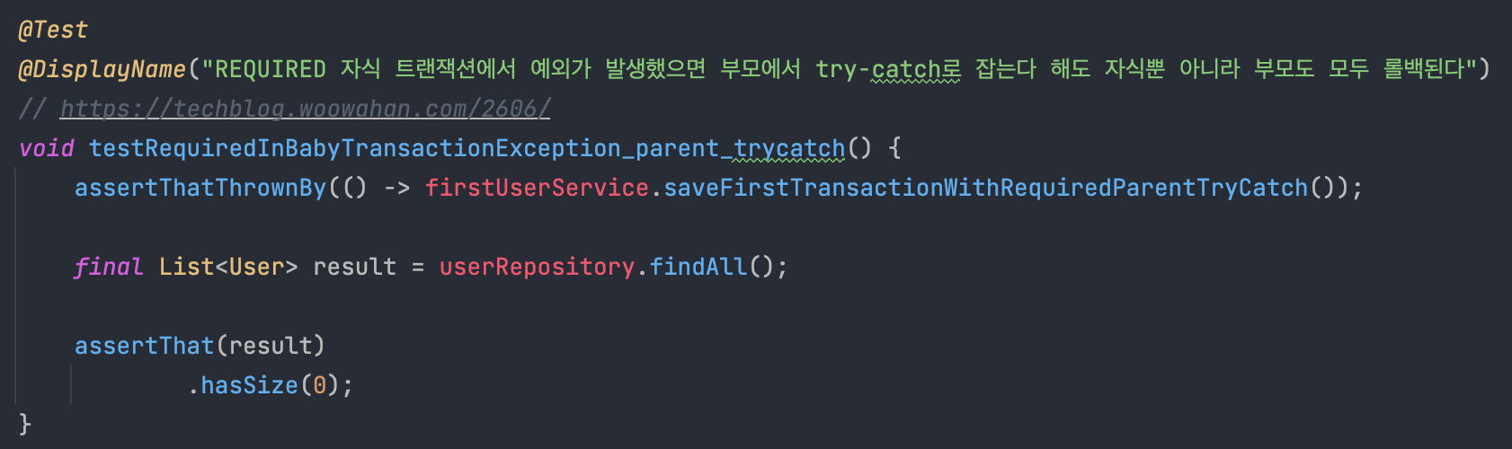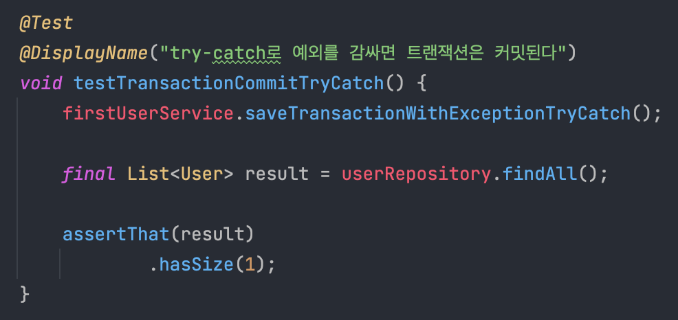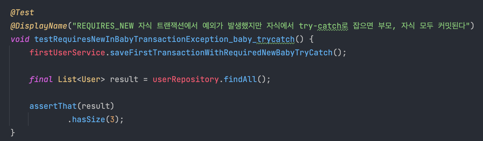 결과는 위와 같다. (부모 트랜잭션 커밋, 자식 트랜잭션 롤백돼서 사이즈 1. @Displayname을 읽는 것을 추천한다.)