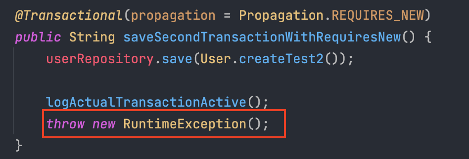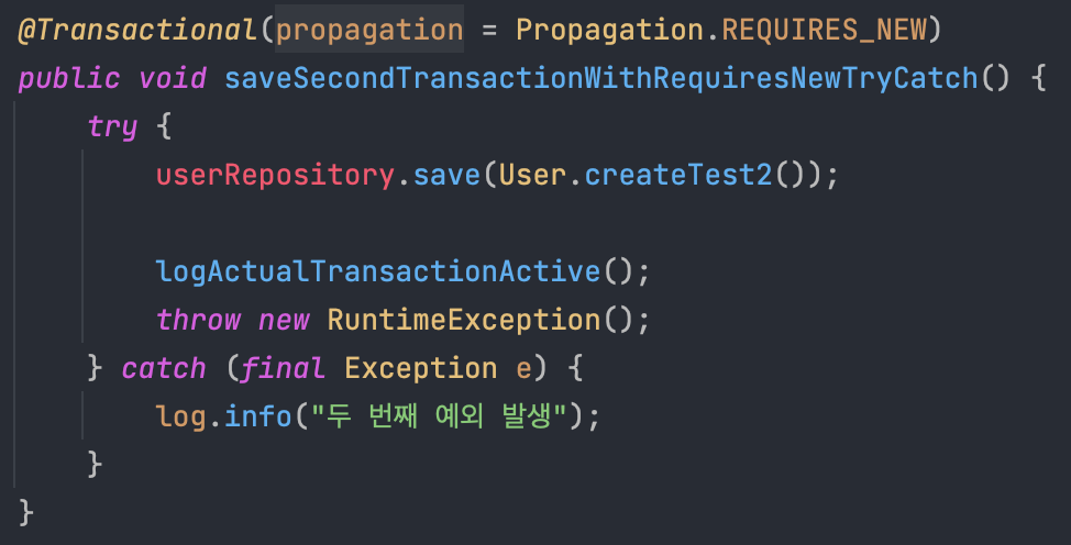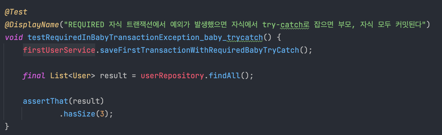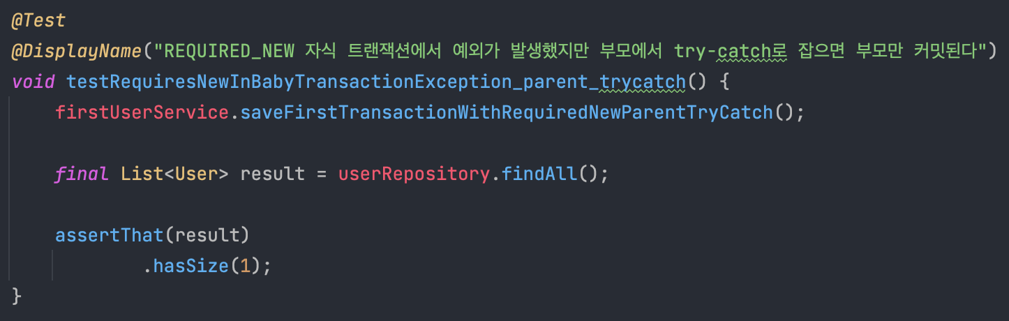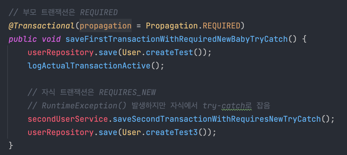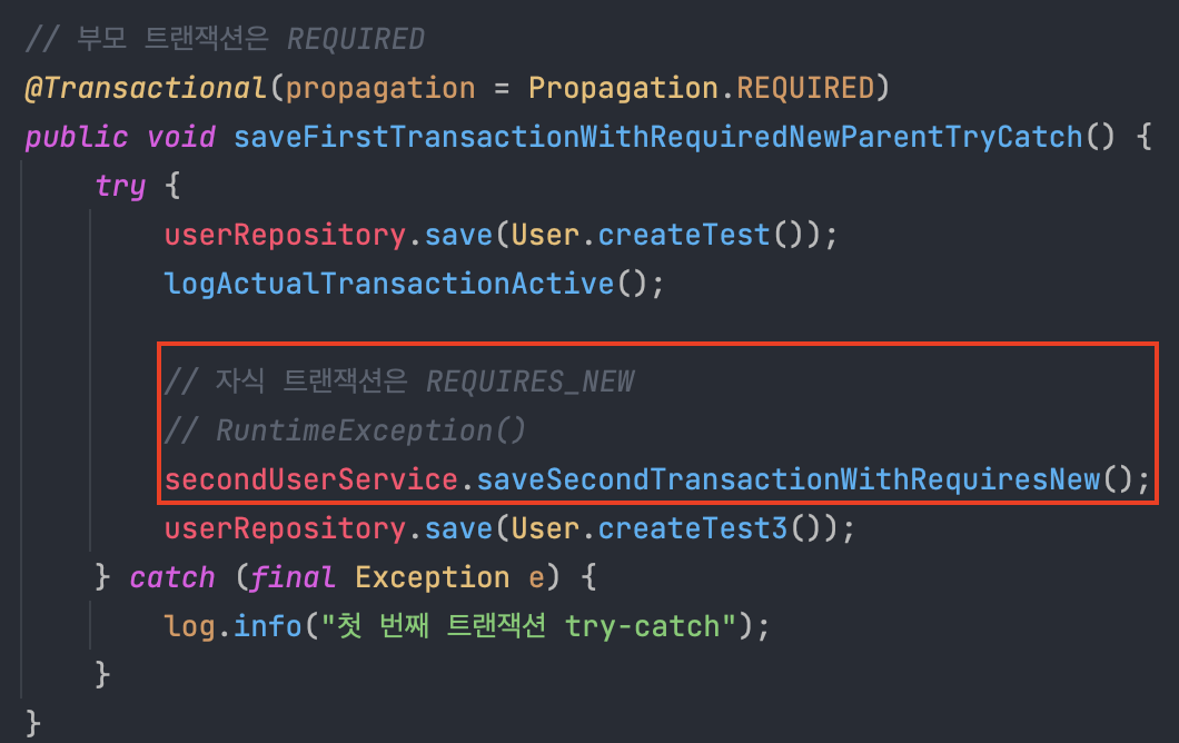 참고로 위 테스트 코드에서 firstUserService.saveFirstTransactionWithRequiredNewParentTryCatch()는 아래와 같다.