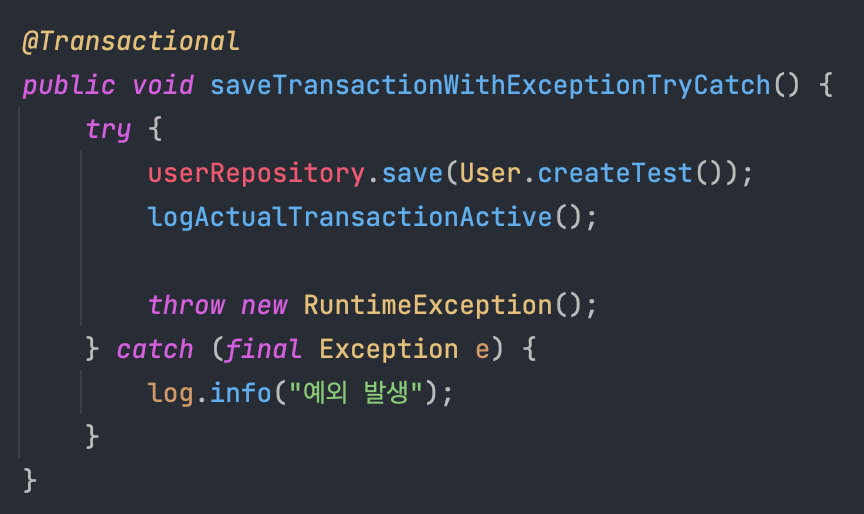 아래처럼 하나의 트랜잭션에서 예외가 발생했을 때 try-catch로 감싸준 상황을 먼저 보자.
