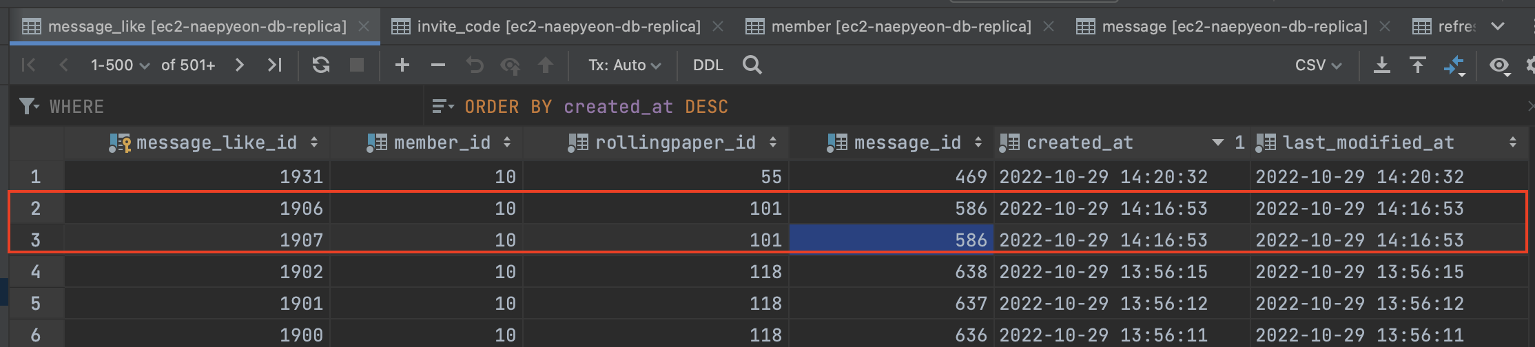하지만 위와 같이 광클하는 경우에는 그 찰나에 같은 회원의 메시지 좋아요가 2개 들어가버린 것을 확인할 수 있었다.