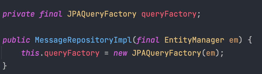 위 코드만 봐서는 new 키워드가 한번만 쓰이므로 크게 문제없을 것 같지만, 메시지 도메인 뿐만 아니라 회원 도메인, 모임 도메인, 롤링페이퍼 도메인 등등. 다양한 도메인의 repository에서 new JPAQueryFactory() 코드를 작성해주어야 한다. 정작 JPAQueryFactory가 도메인마다 다 다른 JPAQueryFactory일 필요도 없는데 말이다.
