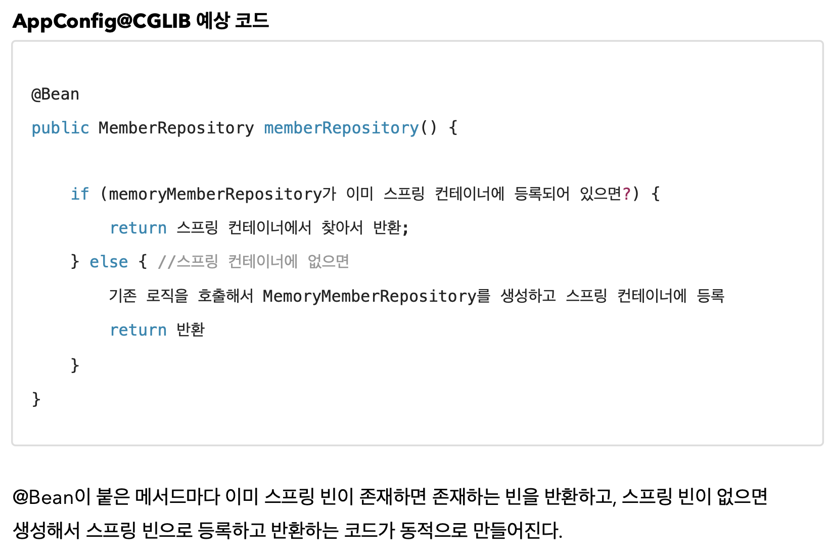요약하자면 @Configuration을 사용하면 @Bean 메서드들 역시 CGLIB 바이트코드 조작 라이브러리를 통해 싱글톤으로 반환하게 해준다는 것이다. 해당 옵션을 사용하지 않도록 설정할 수 있지만, 이는 @Configuration 성격을 죽이는 것과 다름없다. 라고 되어있다.