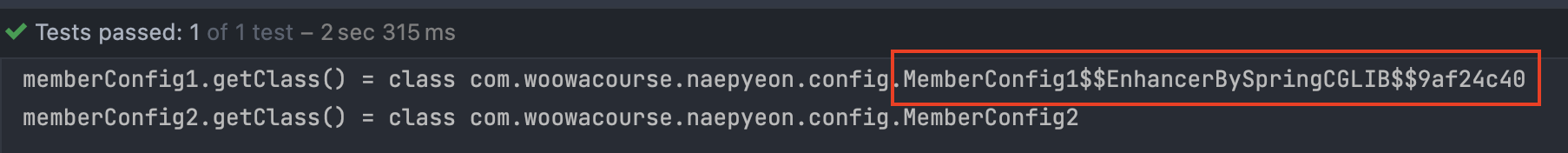 @Component 클래스와 달리 @Configuration이 붙은 클래스는 CGLIB 바이트 조작 라이브러리를 통해 CGLIB Proxy 객체가 생성된 것을 확인할 수 있다. 바로 이 CGLIB Proxy 객체가 스프링 빈을 반환할 때 싱글톤이 보장되게 해주는 것이다.