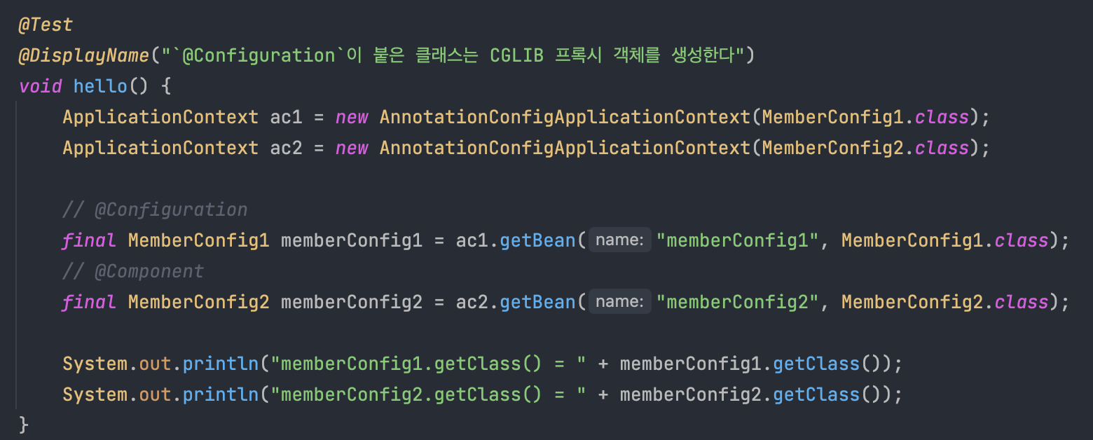 MemberConfig1에는 @Configuration을, MemberConfig2에는 @Component를 붙여주었다.