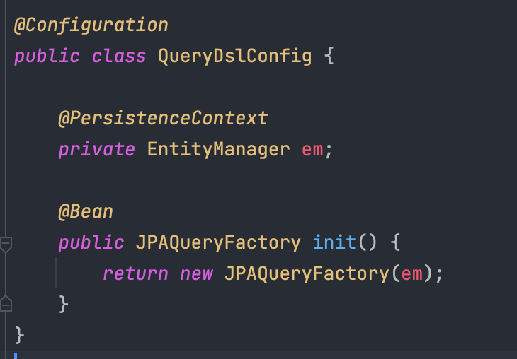 queryDSL을 사용하기 위해 new JPAQueryFactory를 해주고 EntityManager를 DI해주는 모습이다.
