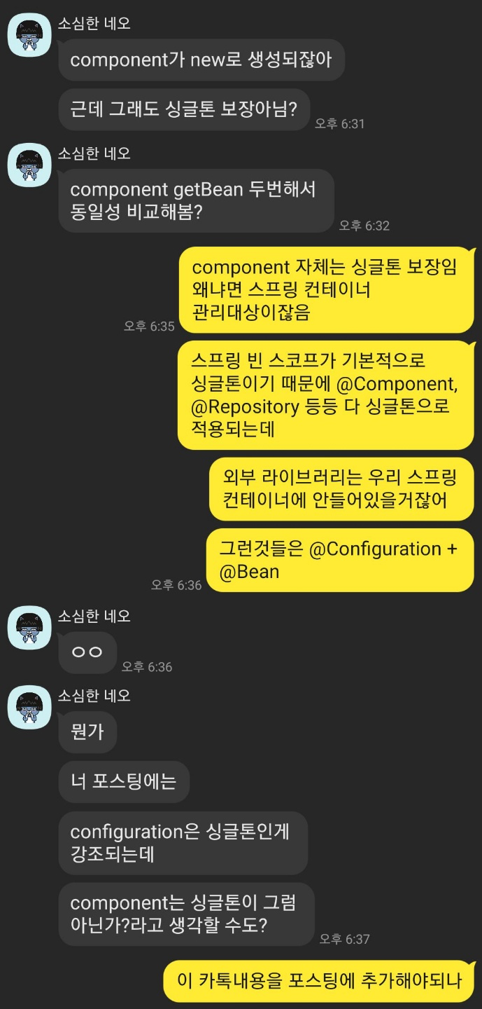 @Configuration이 아닌 @Component를 사용한다면 Java의 new 키워드때문에 매번 힙 인스턴스로 생성되어 메모리에 부하가 가게 된다. 외부 라이브러리 또는 설정 정보 클래스를 반환하는 클래스일 경우 @Configuration를 꼭 붙여주도록 하자.