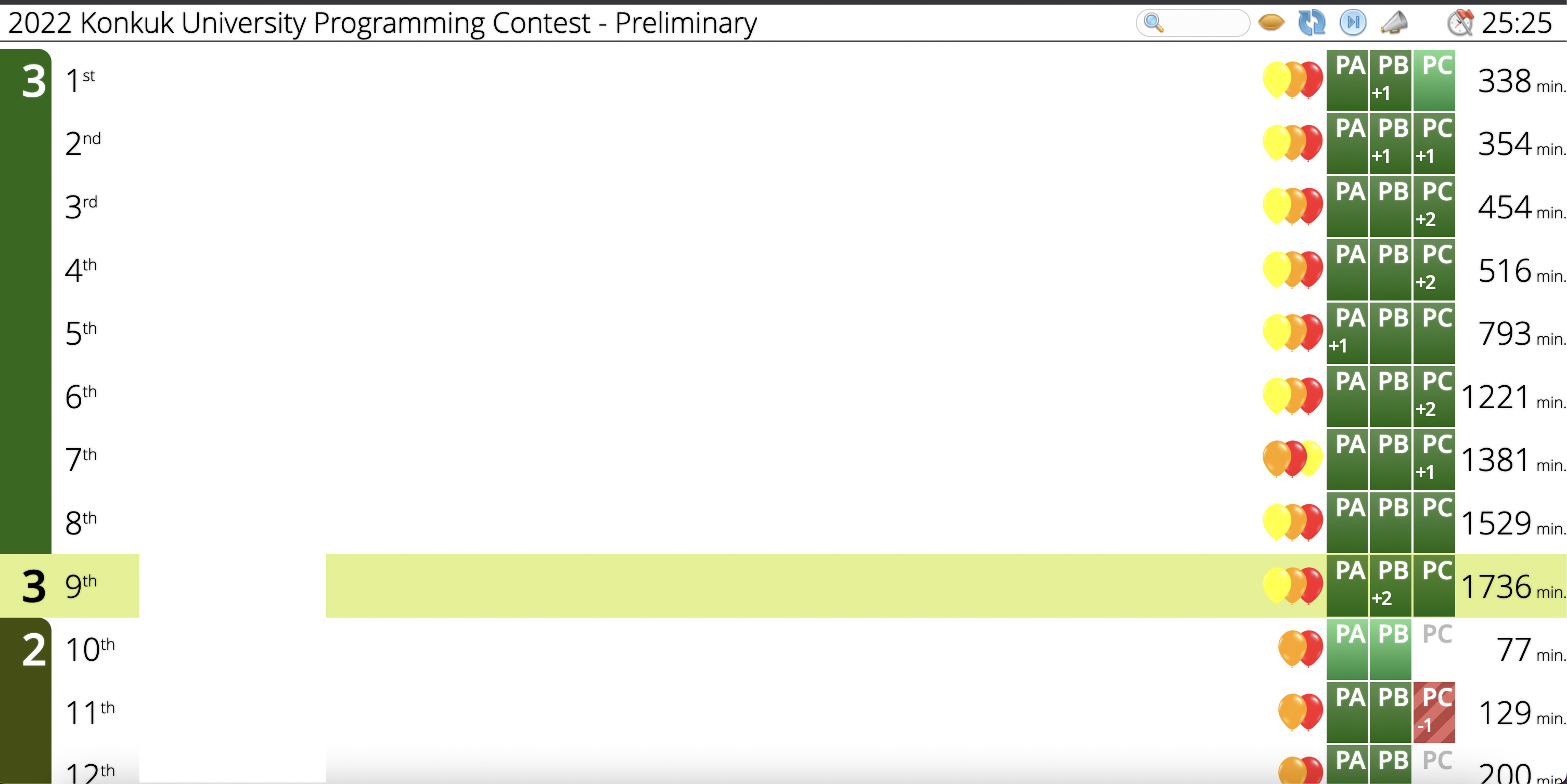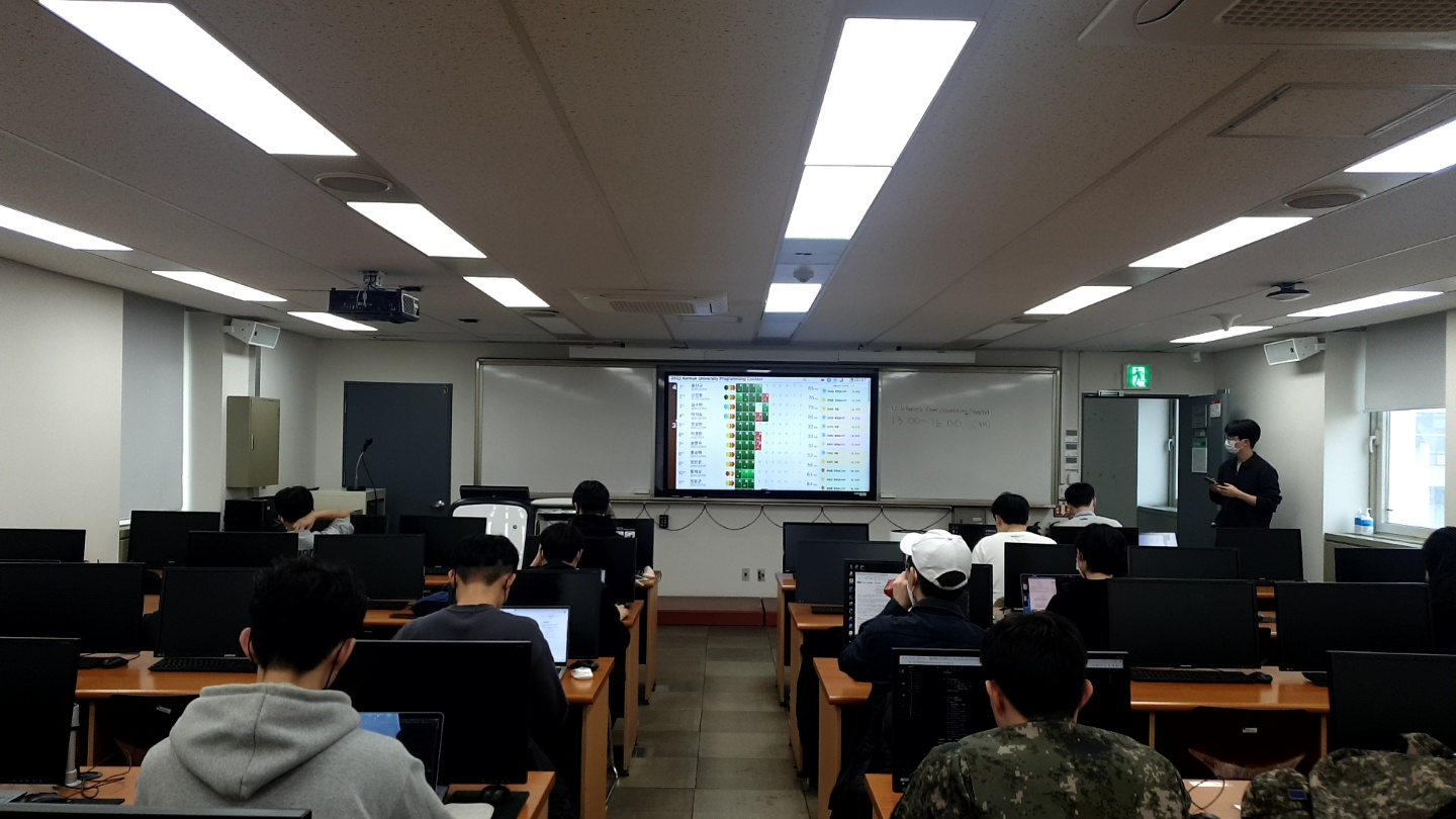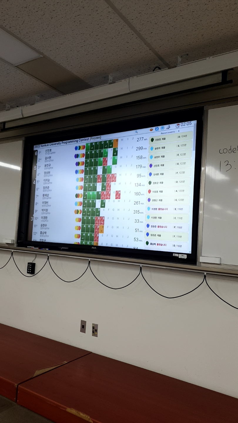 7솔한 사람이 이 때 당시 나오지 않아, 대회종료 1시간 전 조건으로 스코어보드가 프리즈됐다. 따라서 다른 사람들의 제출여부는 보이지만 정답여부는 알 수 없게 해주어 최종등수를 예측할 수 없게 해두었다.