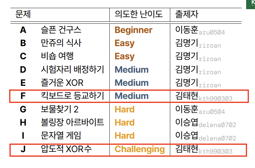 내가 출제한 문제인 압도적 xor수는 0명이 해결했으며, 킥보드로 통학하기는 3명이 해결했다.