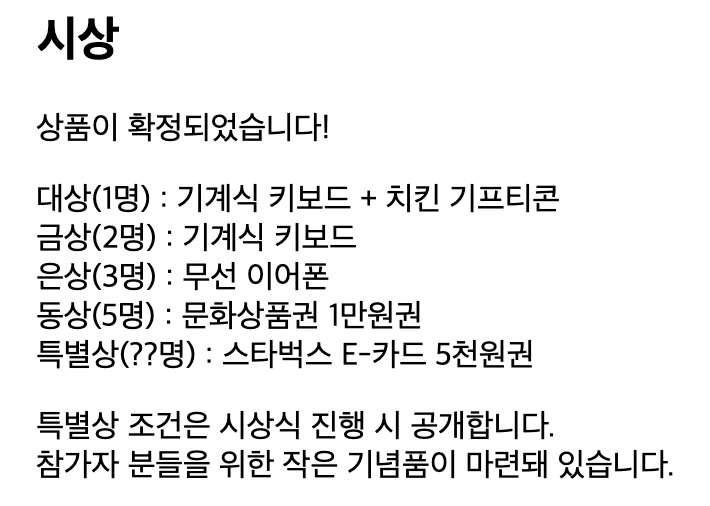특별상 대상에 포함됐던 한 분이 시상식 이전에 대회장을 나가셔서 해당 상품을 못받은 경우가 있어서 아쉬웠다 ㅜㅜ
