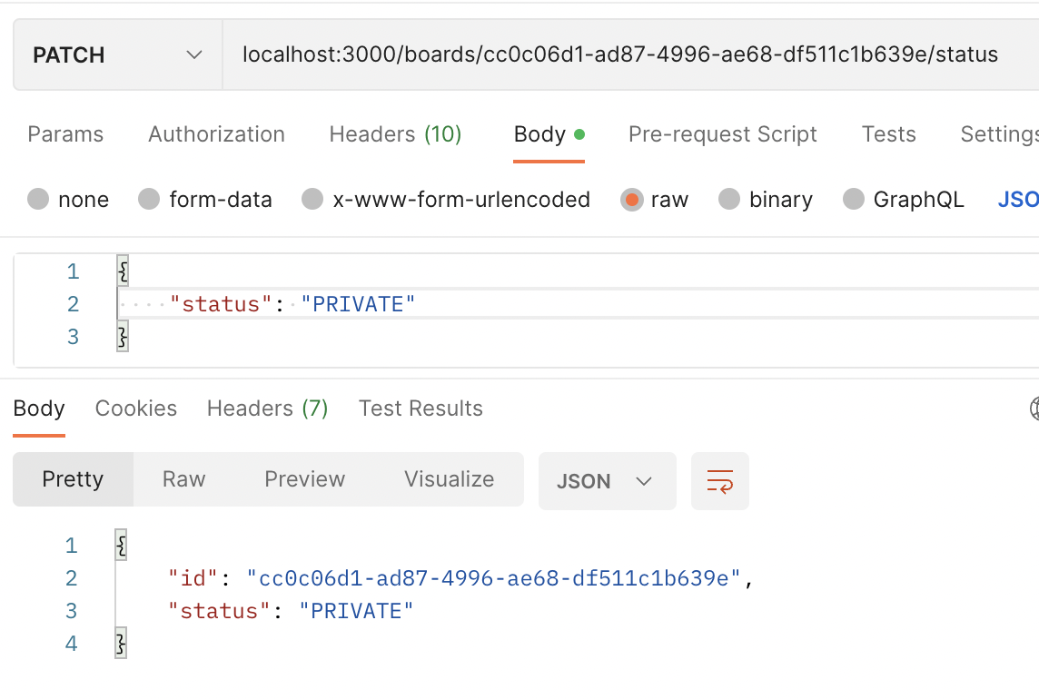 - updateBoardStatus(id: string, status: BoardStatus): Board // 수정