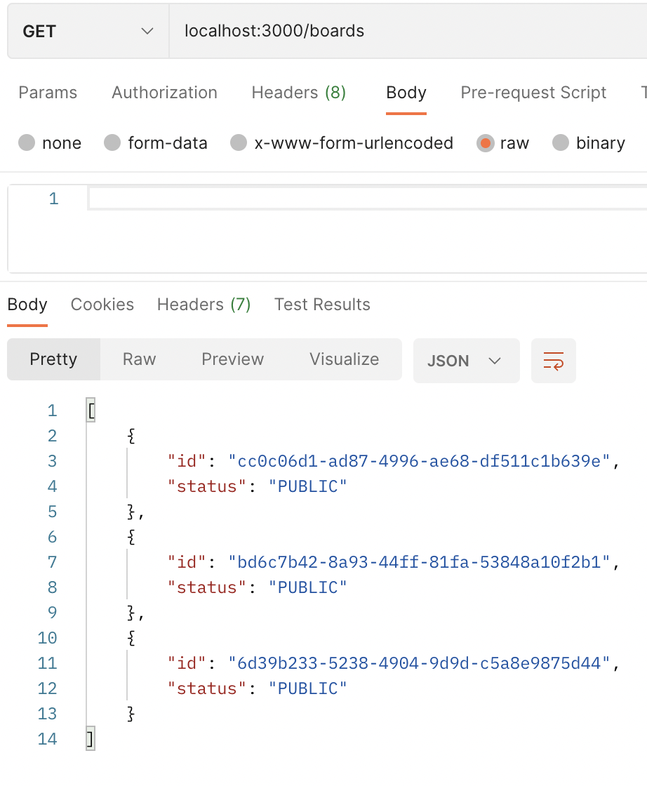 게시글에는 uuid 형식의 id를 가지고 있으며, 그 외에 title, description, status를 가진다.